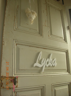 Idag hittade jag en annons på blocket, inte alls långt ifrån där jag bor. Det var ett jättetrevligt par som höll på att renovera en lada samt sitt gamla hus och sålde massvis av fönster och gamla dörrar.. BILLIGT! Ingen blev väl lyckligare än jag?? Så nu har jag varit där och hämtat dörr o fönster i min lilla bil. Hälften av dörren hängde utanför bilen, men det gick bra. Väl hemma stålborstade jag dörren och tvättade den med grönsåpa (men det luktar fortfarande lite koskit om den) ha ha ha! Charmigt! Nu har jag konkat in dörren i mitt vardagsrum, den vägde bly... och nu väntar jag med spänning på att min man ska komma hem och se mitt fina fynd! Han kommer antagligen tycka att jag är helt från vettet, men det var lite svårt att "gömma undan" den stora dörren. hi